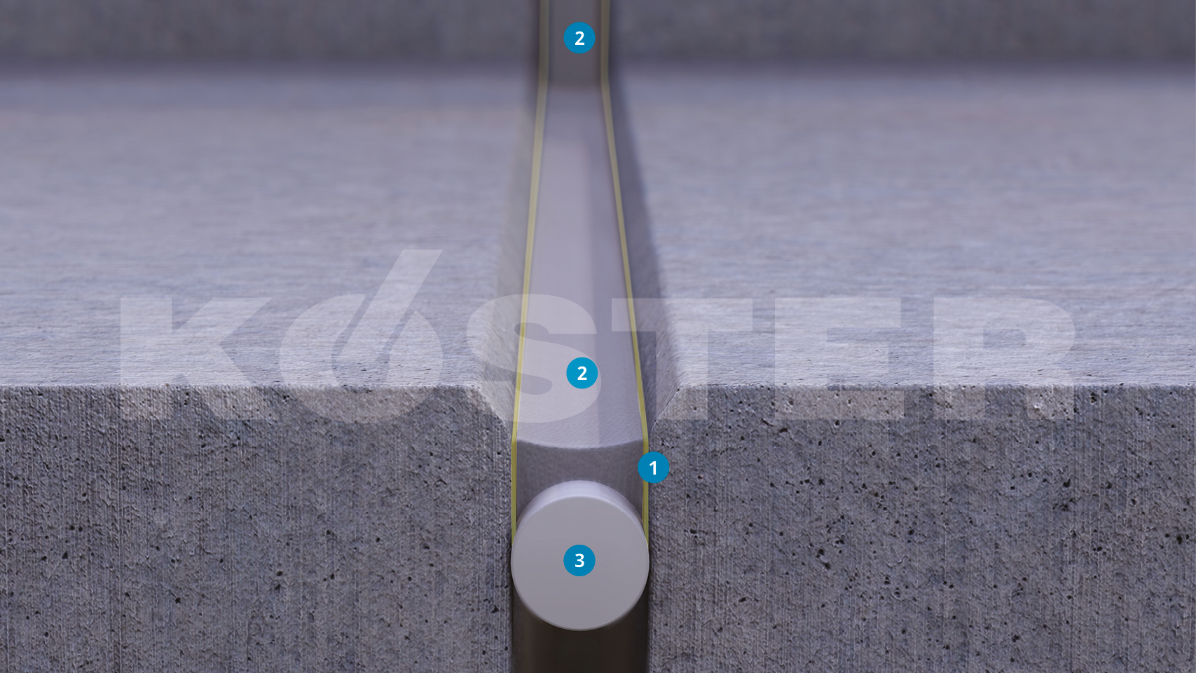 Installando KÖSTER Joint Sealant FS in modo che aderisca solamente ai due fianchi del giunto, si garantisce un assorbimento ottimale della tensione, consentendo al materiale di espandersi attraverso il giunto di costruzione. Per separare la sigillatura del giunto dal fondo, si installa un cordolo tondo in PE prima di applicare il materiale. Per evitare danni causati da tensioni di trazione il sigillante per giunti viene applicato in spessori dipendenti dalla larghezza del giunto. La proporzione del sigillante applicato deve essere da 1: 1 a 1: 2 (altezza rispetto alla larghezza del giunto).