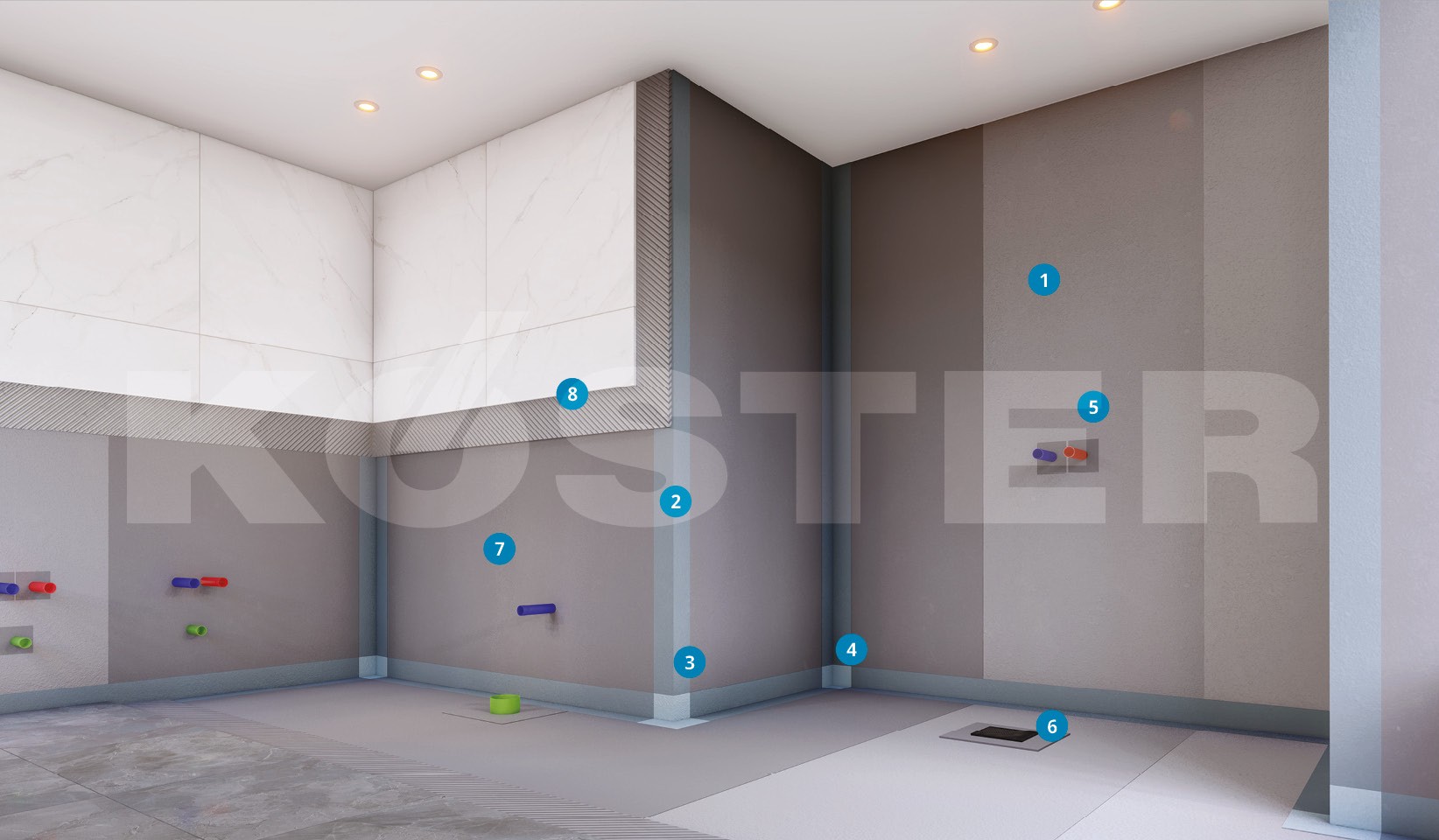 Il sistema KÖSTER BD-System è un sistema completo per l'impermeabilizzazione sotto le piastrelle secondo ETAG 022. Il supporto asciutto e stabile viene pre-trattato con KÖSTER BD 50 Primer. Come strato impermeabilizzante si applica KÖSTER BD 50. Negli angoli e nelle aree di collegamento gli elementi impermeabilizzanti preformati KÖSTER BD Inside Corner, KÖSTER BD Outside Corner, KÖSTER BD Wall Sleeve e KÖSTER BD Floor Sleeve sono incorporati nello strato impermeabilizzante. In corrispondenza delle giunzioni e dei giunti parete / pavimento viene incorporato KÖSTER BD Flex Tape K 120. Nelle aree in cui è incorporato un rinforzo, i movimenti non danneggeranno il materiale impermeabilizzante.
