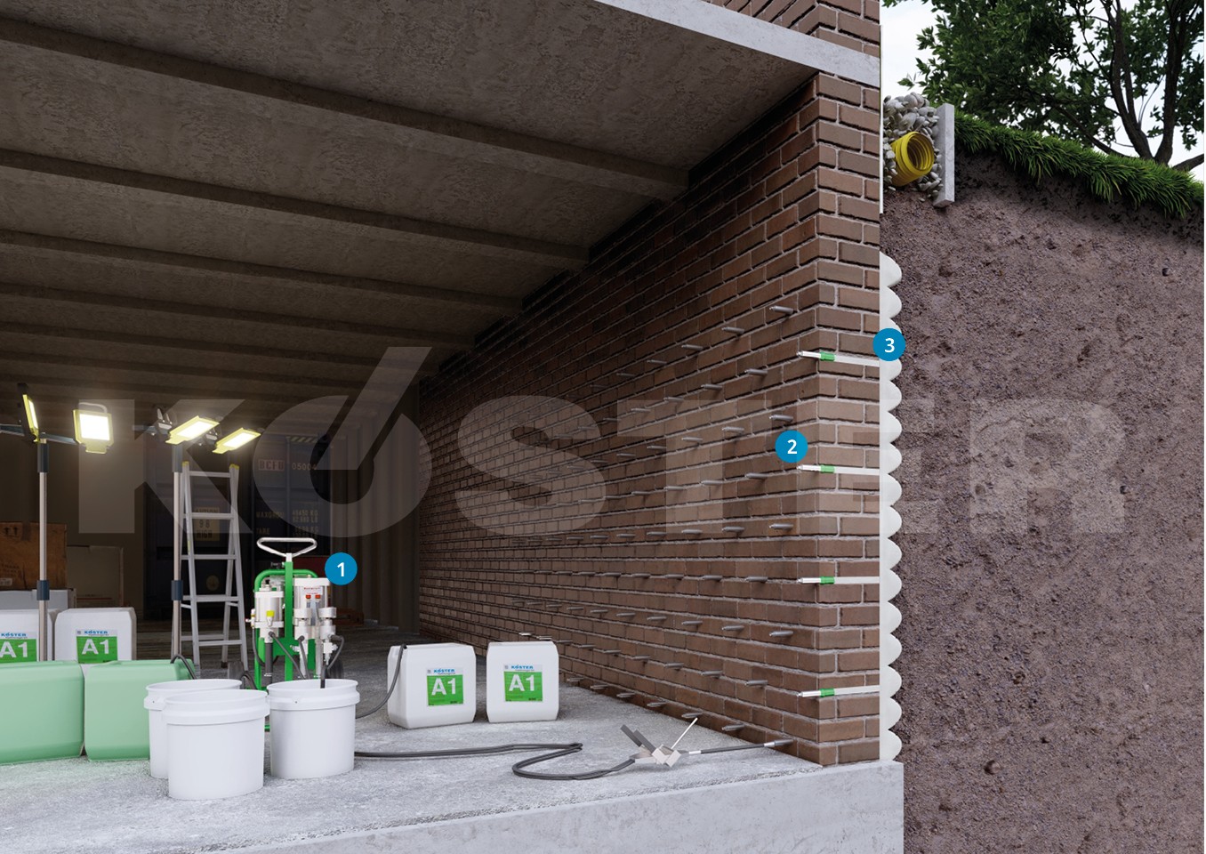In questi casi è possibile scegliere una iniezione a velo con KÖSTER PUR Gel: la resina viene iniettata attraverso il muro dall'interno verso l'esterno. La resina reagisce con l'acqua e si stabilizza in un solido elastico e impermeabile. L'iniezione viene effettuata con una speciale pompa bi-componente, la KÖSTER Gel Pump, e per mezzo degli accessori brevettati KÖSTER Distributor Lances. Il prodotto iniettato si distribuisce nel muro esterno e in breve tempo reagisce formando uno strato impermeabile. Un metodo alternativo è quello di iniettare KÖSTER PUR Gel all'interno del muro stesso. Questa tecnica chiamata "iniezione ad area" è possibile com materiali da costruzione porosi o con cavità. In questo ultimo caso il gel KÖSTER PUR reagisce con l'acqua presente nel muro per formare un solido elastico e impermeabile.