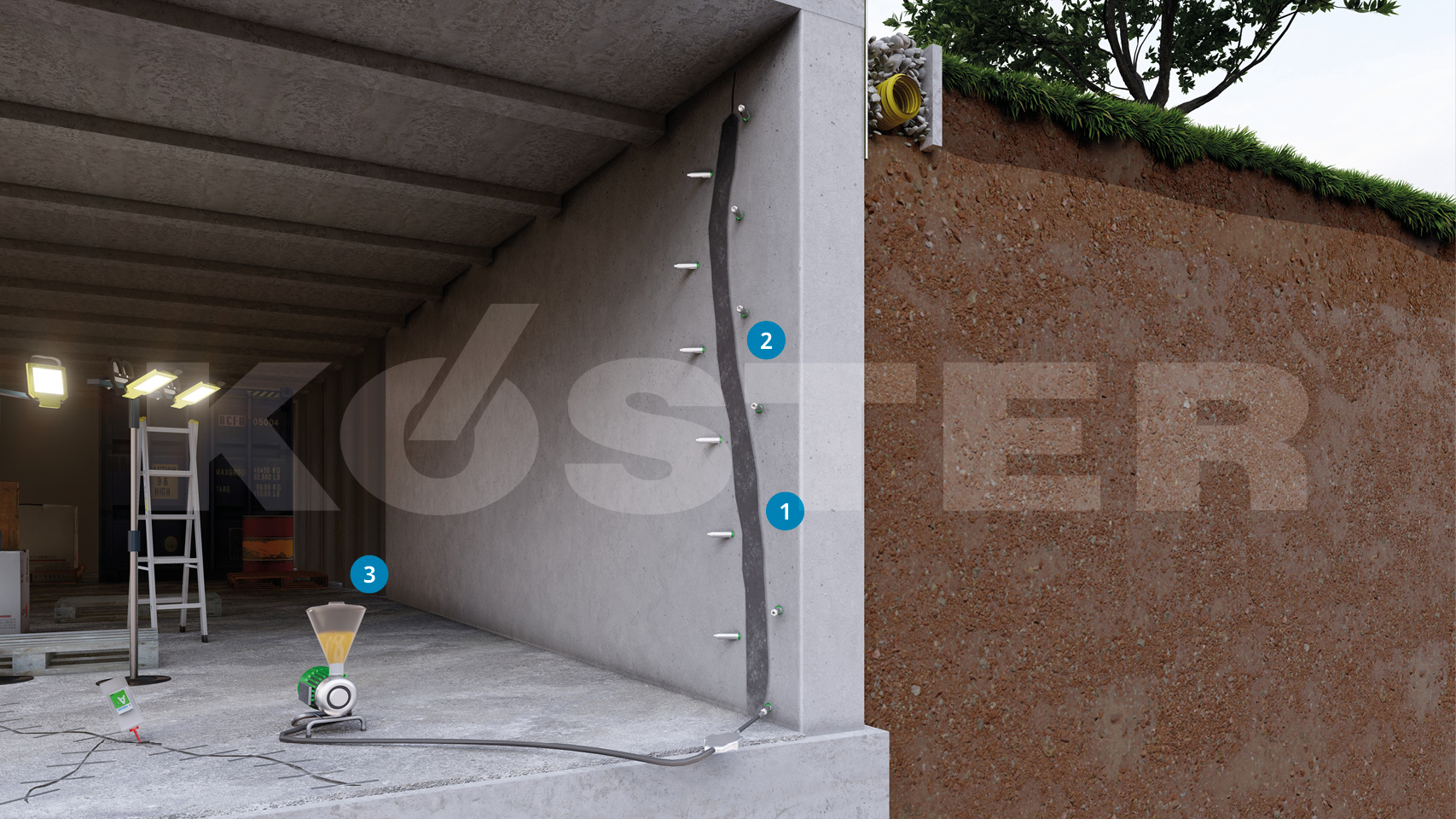 Nel caso di fessure con venute d'acqua, si applica un sistema combinato di KÖSTER IN 1 (schiumogeno a reazione molto rapida a contatto con l'acqua) e KÖSTER IN 2 (utilizzata per sigillare permanentemente le fessure).