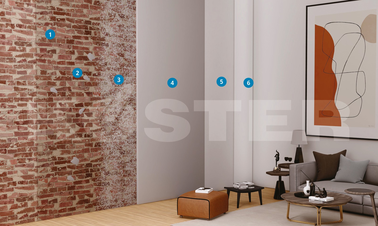 L'intonaco KÖSTER Restoration Plaster è disponibile in differenti versioni (grigio, bianco, fast e light). L'intonaco KÖSTER Restoration Plaster 2 White è utilizzato spesso negli edifici storici, senza la successiva pittura. Qualora il progetto lo richieda, si può applicare KÖSTER Plaster Coat per creare una superficie molto liscia. Gli intonaci KÖSTER Restoration Plaster possono essere successivamente pitturati solo con prodotti traspiranti (aperti alla diffusione di vapore) come KÖSTER Silicon Paint White oppure KÖSTER MF 1.